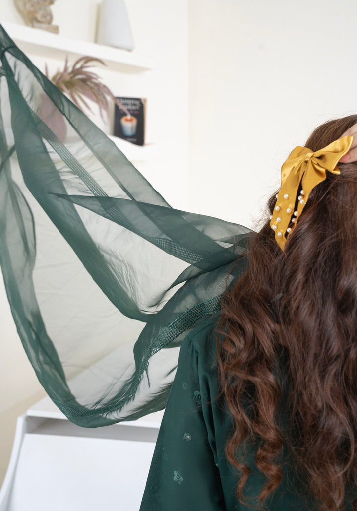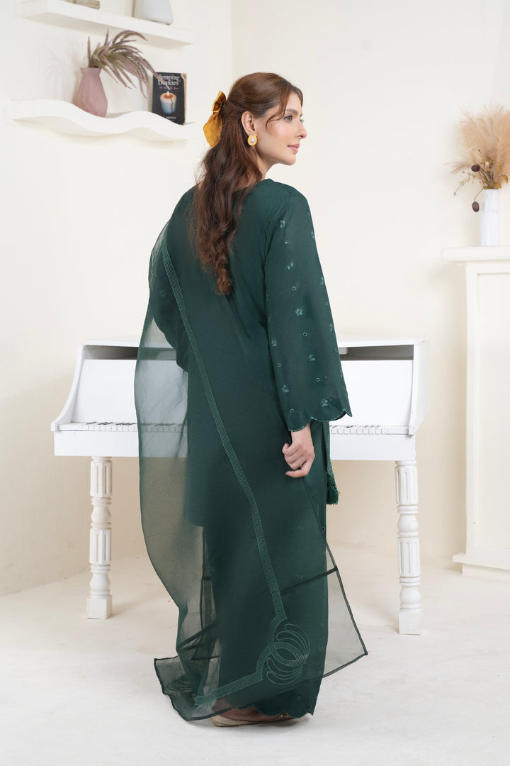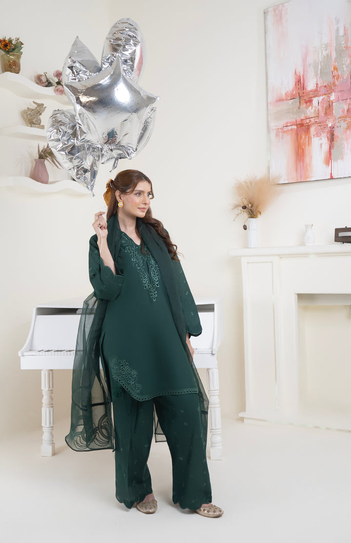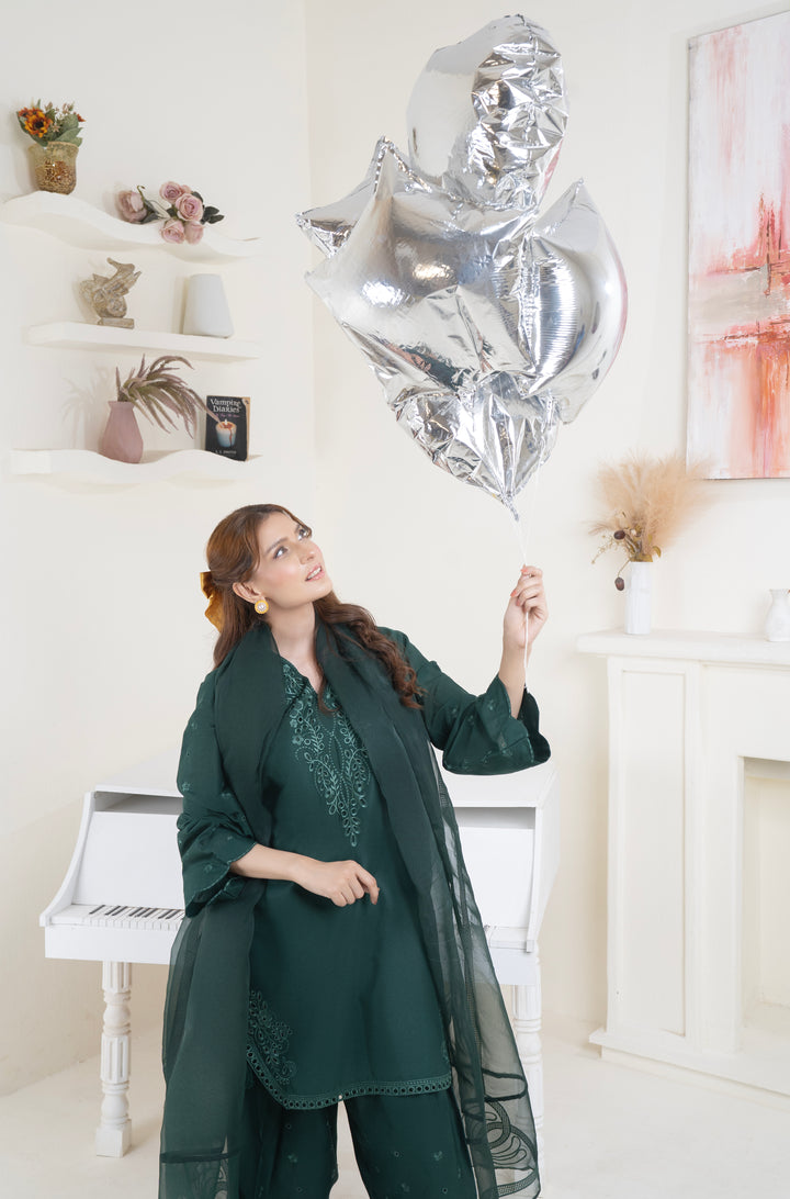 Material: Cotton. 3-Pc (Shirt & Farshi Shalwar) Castleton green cotton with self-color embroidered shirt and farshi shalwar with an organza dupatta.