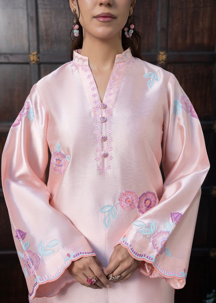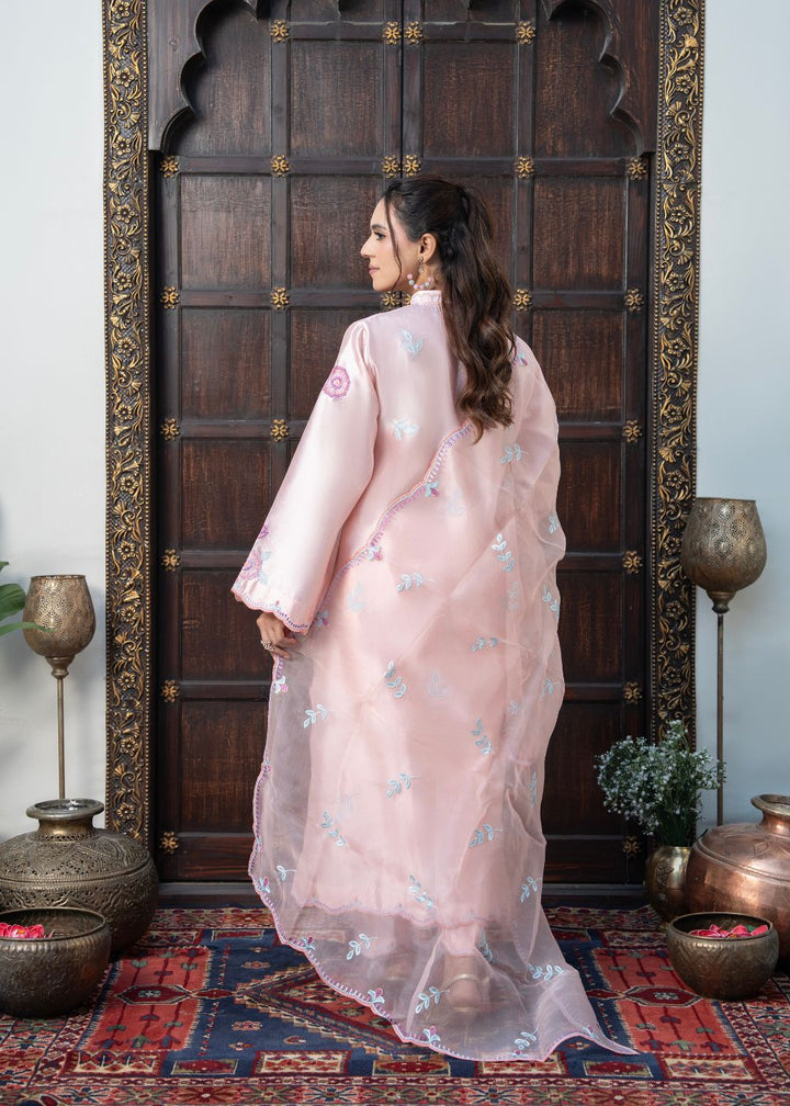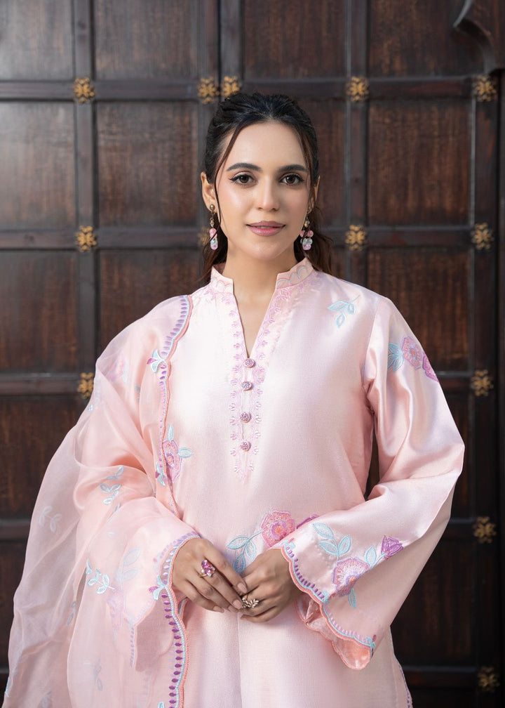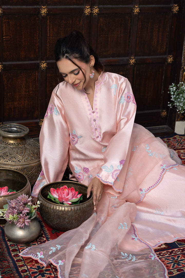 Effortless grace meets artistic craftsmanship in this straight long shirt ensemble. Delicately scattered across the fabric, floral motifs are rendered in intricate embroidery designed to mimic the softness and nuance of pencil colour shading.graceful, cohesive finish. The look is completed with a diaphanous organza dupatta, featuring an all-over leaf motif enhanced with tonal sd look.