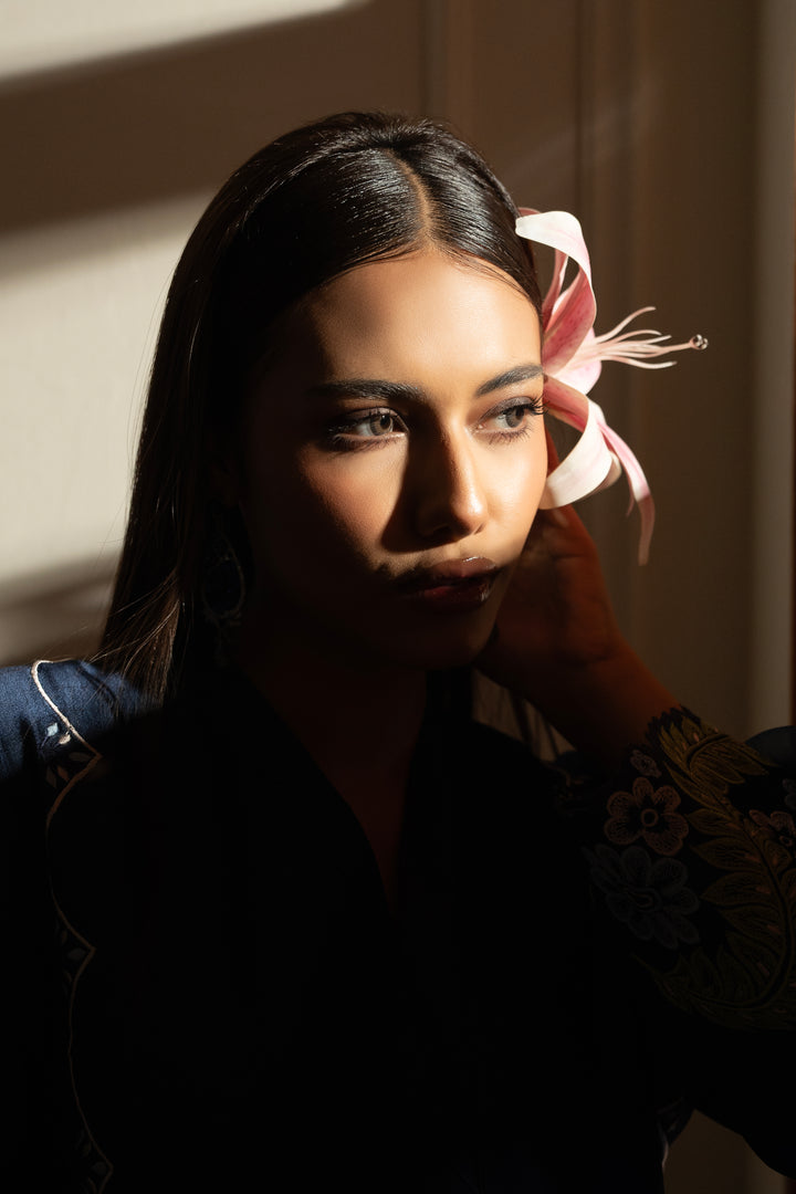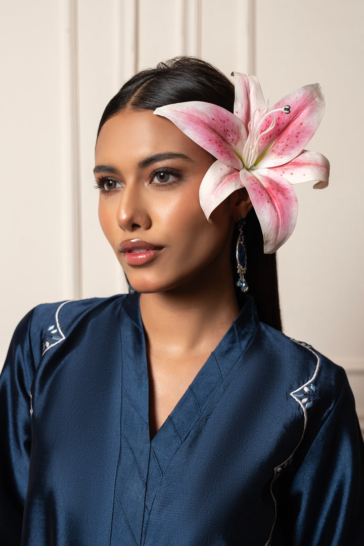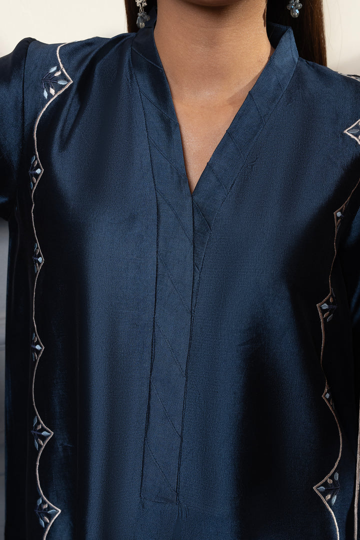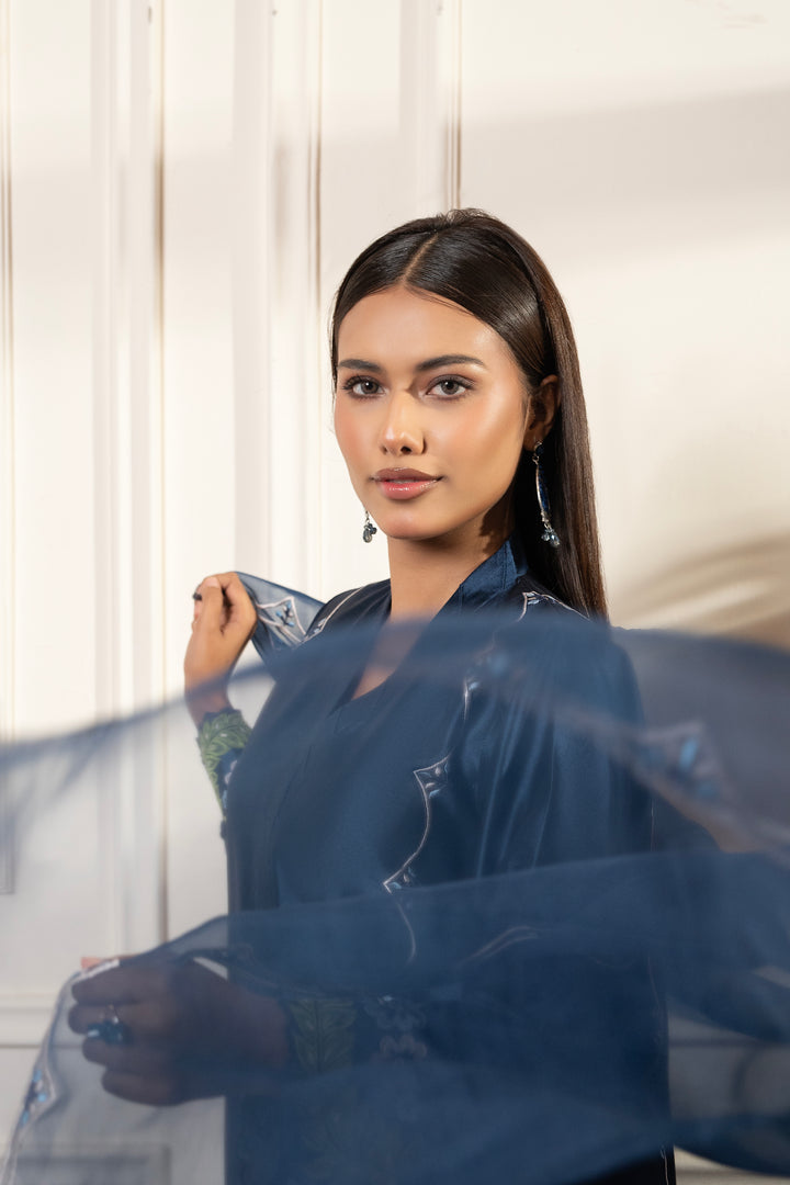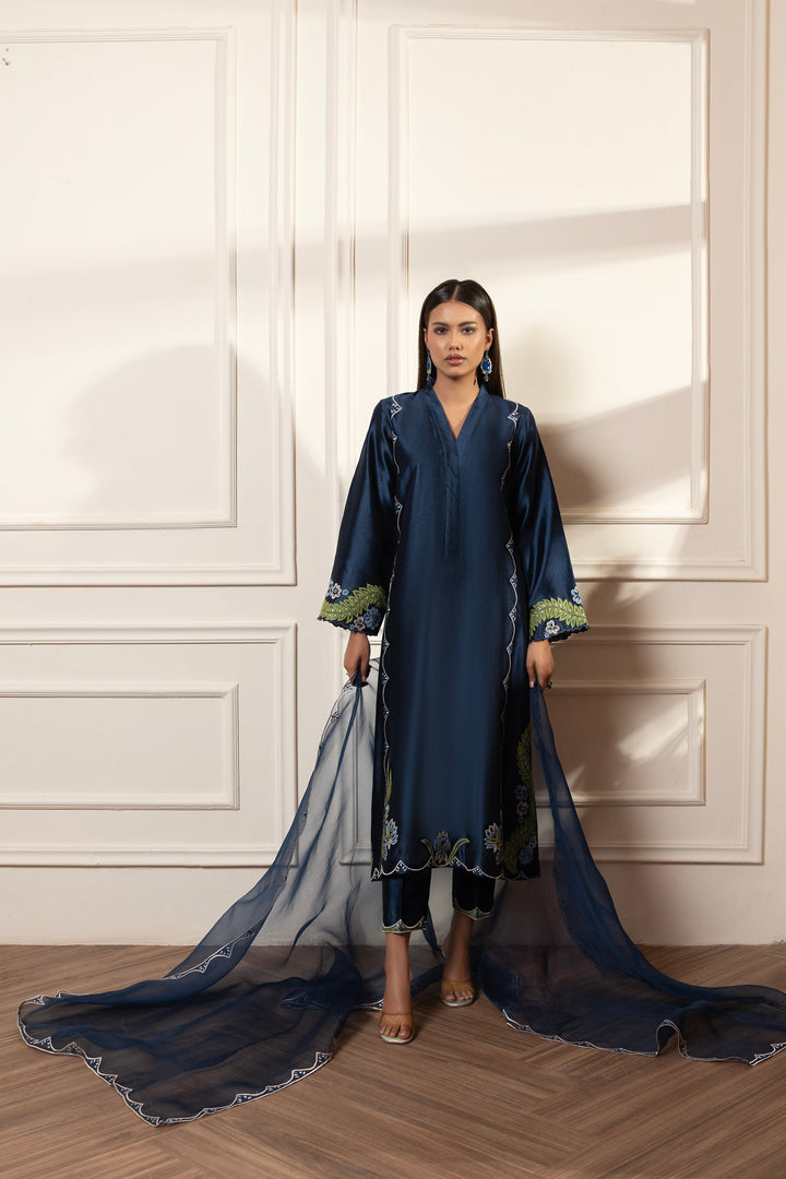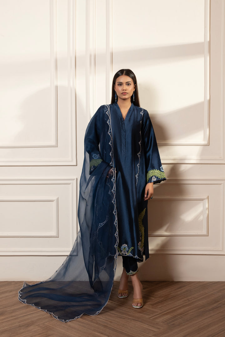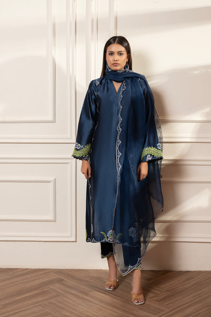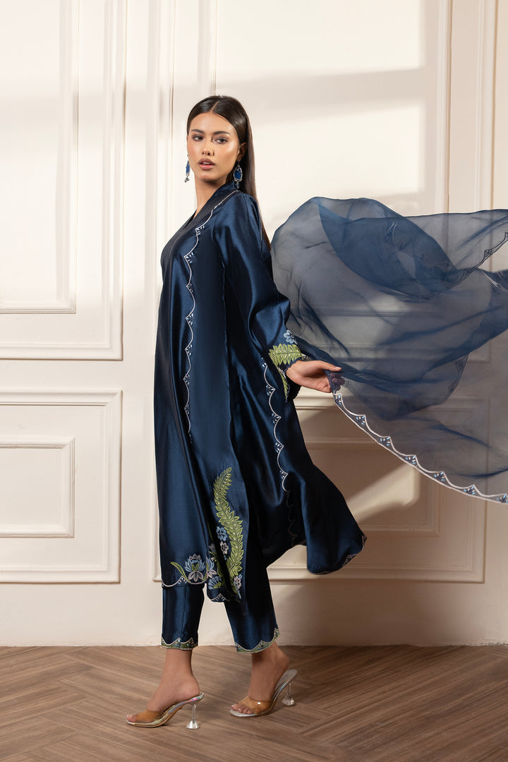 Inspired by an enchanting forest, a pure sheesha silk a-line shirt in a midnight blue hue has embroidery shirt and pant with graceful embroidery and pure organza dupatta with embroidery work.