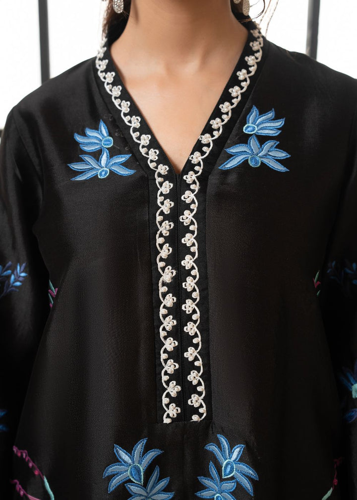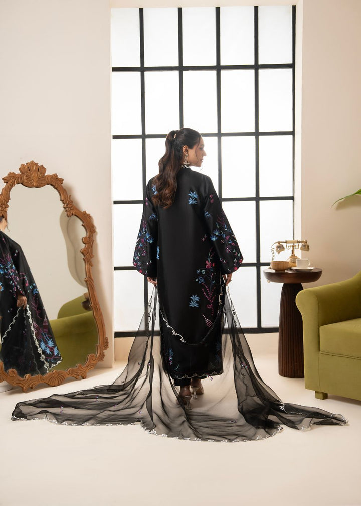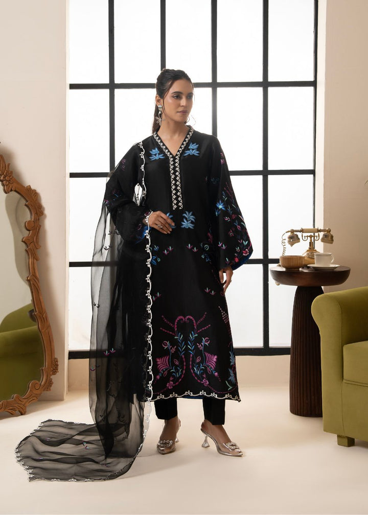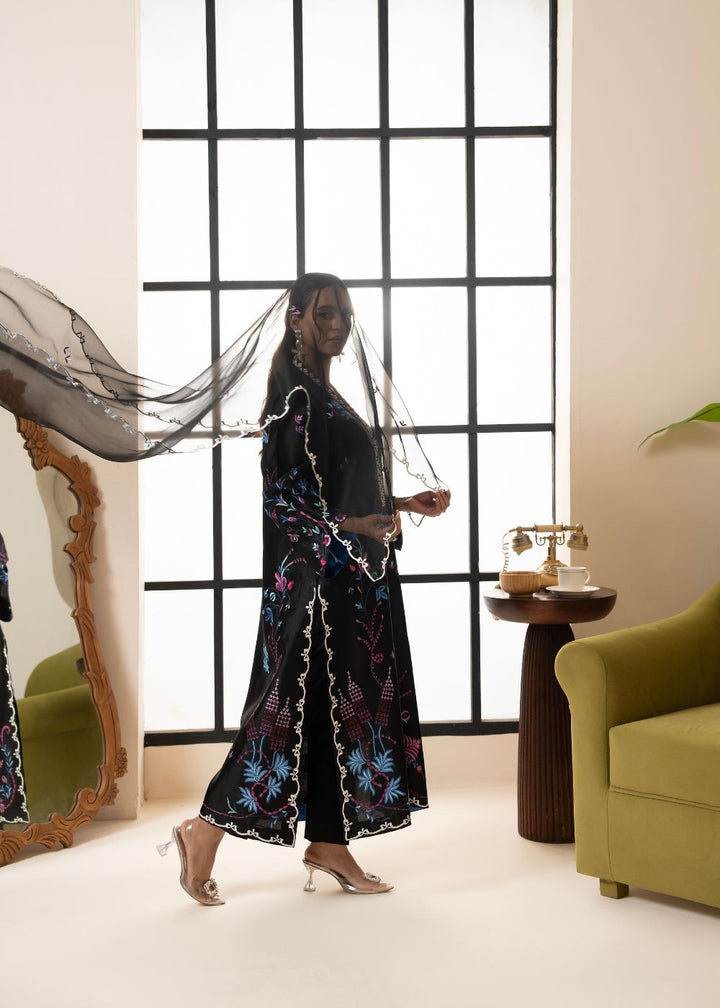 Effortless grace meets artistic craftsmanship in this straight long shirt ensemble. Delicately scattered across the fabric, floral motifs are rendered in intricate embroidery designed to mimic the softness and nuance of pencil colour shading.graceful, cohesive finish. The look is completed with a diaphanous organza dupatta, featuring an all-over leaf motif enhanced with tonal sd look.